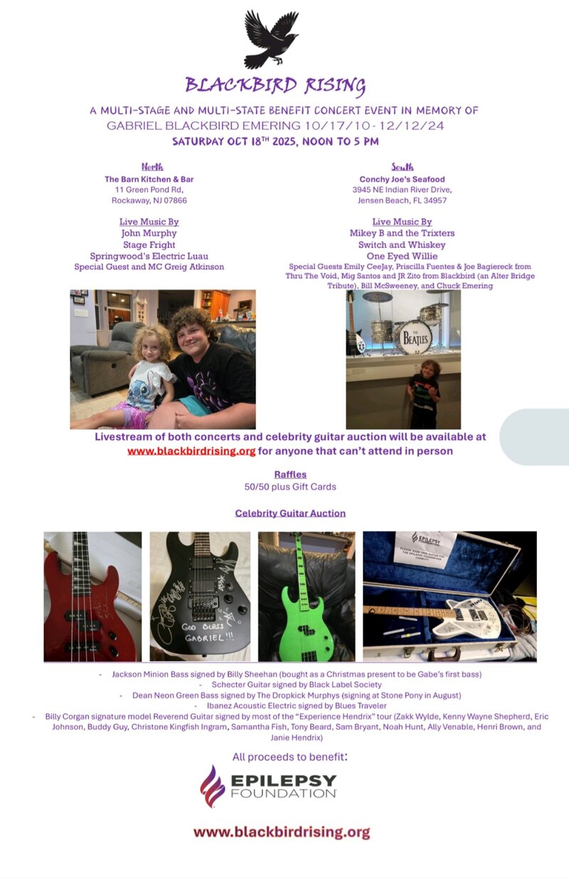 Event Date: October 18th 2025"Blackbird Rising" Benefit Concert Event in honor of Gabriel Blackbird Emering who passed away on 12/12/2024. All proceeds will be going to The Epilepsy Foundation of America and to the Art and Stem Programs at Copeland Middle School. 12:00 - 12:15 Introductions and Announcements by Greg Atkinson 12:15 - 1:15 John Murphy Solo Acoustic 1:45 - 2:45 Stage Fright Band 3:15 - 4:30 Springwoods Electric Luau 4:30 - 5:00 Raffles, Guitar Auction, Closing. https://www.blackbirdrising.org/